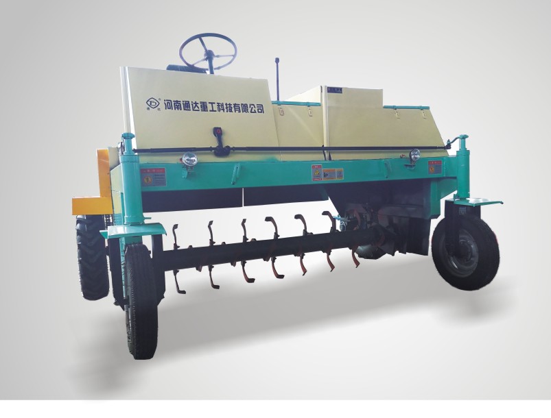 行走式有機肥料翻堆設備是生產生物有機肥專用成套設備中的主機。是以畜禽糞便、污泥、酒糟、糠醛渣等粘稠物料采用條垛式發酵工藝。即能對物料均勻攪拌、攏堆,又能對物料的板結塊進行大三疏松。該機采取四輪行走設計,可前進、倒退、轉彎,由一人操控駕駛。行駛中整車騎跨在預先堆置的長條形肥基上,由機架下掛裝的旋轉刀軸對肥基原料實施翻拌、蓬松、移堆,車過之后篡成新的條形垛堆。即可在開闊場地,也可在車間大棚中實施作業。該機一大技術突破在于整合了物料發酵后期的破碎功能。隨著物料逐漸脫水,加裝破碎裝置的刀軸可有效地破碎肥料在發酵過程中形成的板塊,不僅省去了一臺粉碎機,更主要的大大提高了粉碎的效率,降低了成本,從根本上解決了生產量受粉碎機制約的問題。該設備動力為水冷型柴油機,其投資少、能耗低,使用靈活方便,節省了土建工程和大量的人力物力。